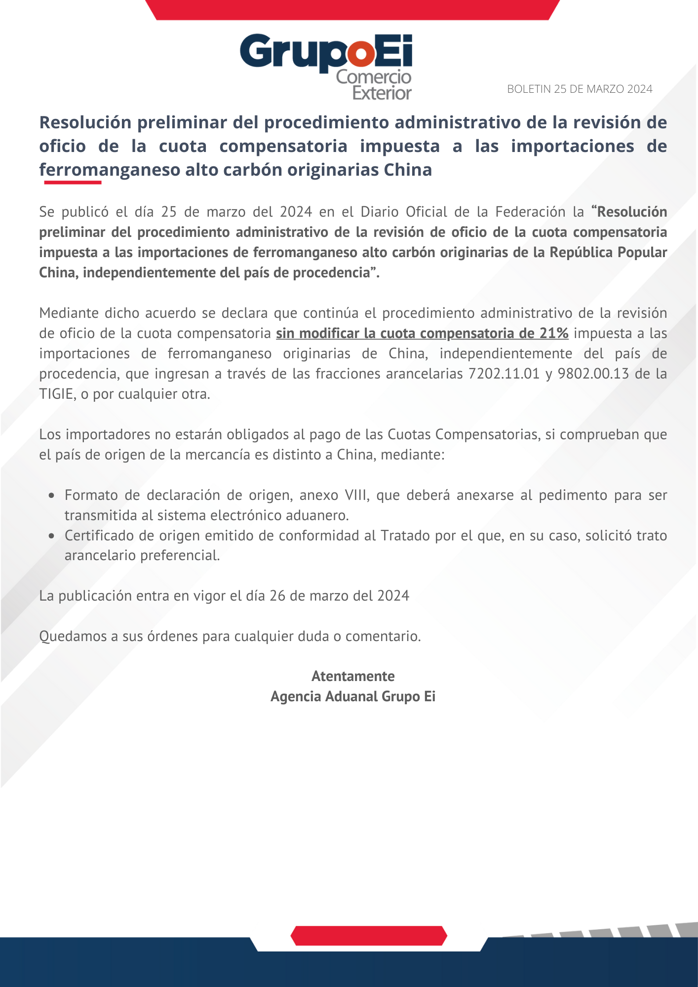 Se publico el 25 de marzo de 2024 en el Diario Oficial de la Federación la "Resolución preeliminar del procedimiento administrativo de la revisión de oficio de la cuota compensatoria impuesta a las importaciones de ferromanganeso alto carbón, originarias de la República Popular China independientemente del país de procedencia". La publicación entra en vigor el día 26 de marzo de 2024.