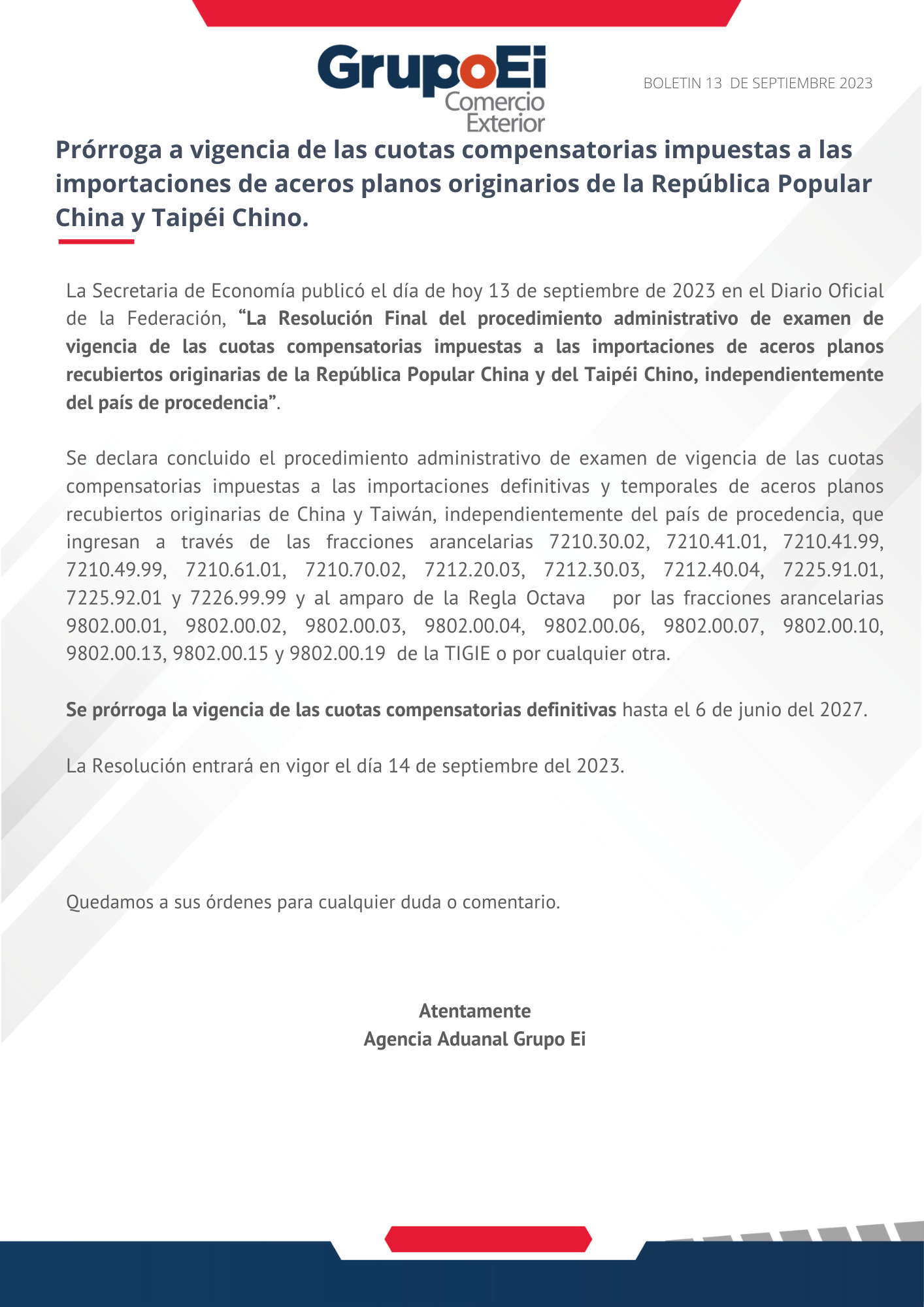 La Secretaria de Economía publicó el 13 de septiembre de 2023 en el Diario Oficial de la Federación. "La Resolución Final del procedimiento administrativo de examen de vigencia de las cuotas compensatorias impuestas a las importaciones de aceros planos recubiertos originarios de la República Popular China y del Taipéi Chino, independientemente del país de procedencia".